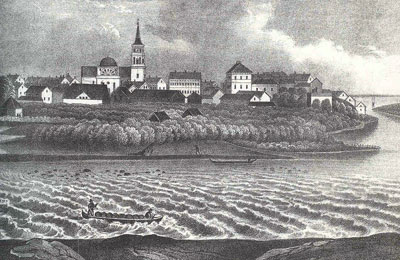 En folksamling omgaf, efter vanligheten, sin idole – vagnen, och en kronobetjänt hade självmant infunnit sig for ordningens bibehållande. Han fick recompence, och vi fortsatte i maklighet – det är tredje dagen vi skriva från Torneå till Uleåborg – vår fart till Kaupila ggd och därifrån, sluteligen till Uleåborgs stad, sedan vi med mycket besvär transporterat oss över Uleå älv, som, fastän att vädret ej var särdeles våldsamt jag likväl anser lika brydsam som Ångermanlands älven eller Gäddviks-sund ( Luleå älv). Vid ankomsten till bryggan mötte oss en mängd sändebud från nyfikenheten, vilka dock ej fingo audiens hos oss, som endast hade till föremål ett gott nattläger, som vi verkligen funno hos Fru Hejkel, vilken, endast då ansedde Resande kommo till Staden, brukade denna logis, hade antagit förbudets proposition och tillika, emot vanan, åtagit sig att föda oss. Vi funno en delikat middag, med gott vin och franska konfiturer, färdig, som vi genast vid ankomsten kl.7 e.m. togo i ögonsikte.